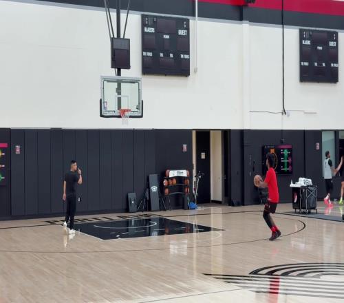 籃球資訊10月21日宣 開拓者隨隊記者Sean Highkin曬照,開拓者后衛亨德森訓練后單獨進行了投籃練習,楊瀚森的翻譯劉禹鋮(克里斯)在旁邊幫他撿籃板。